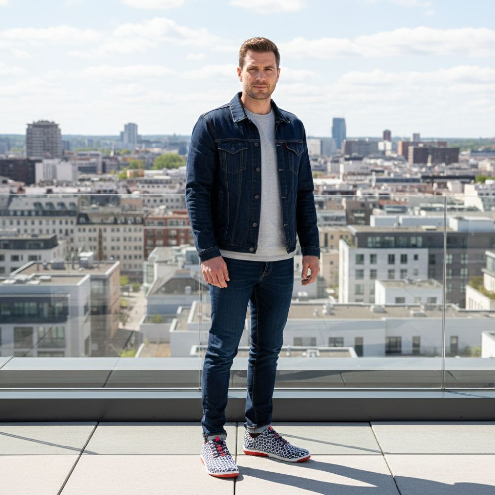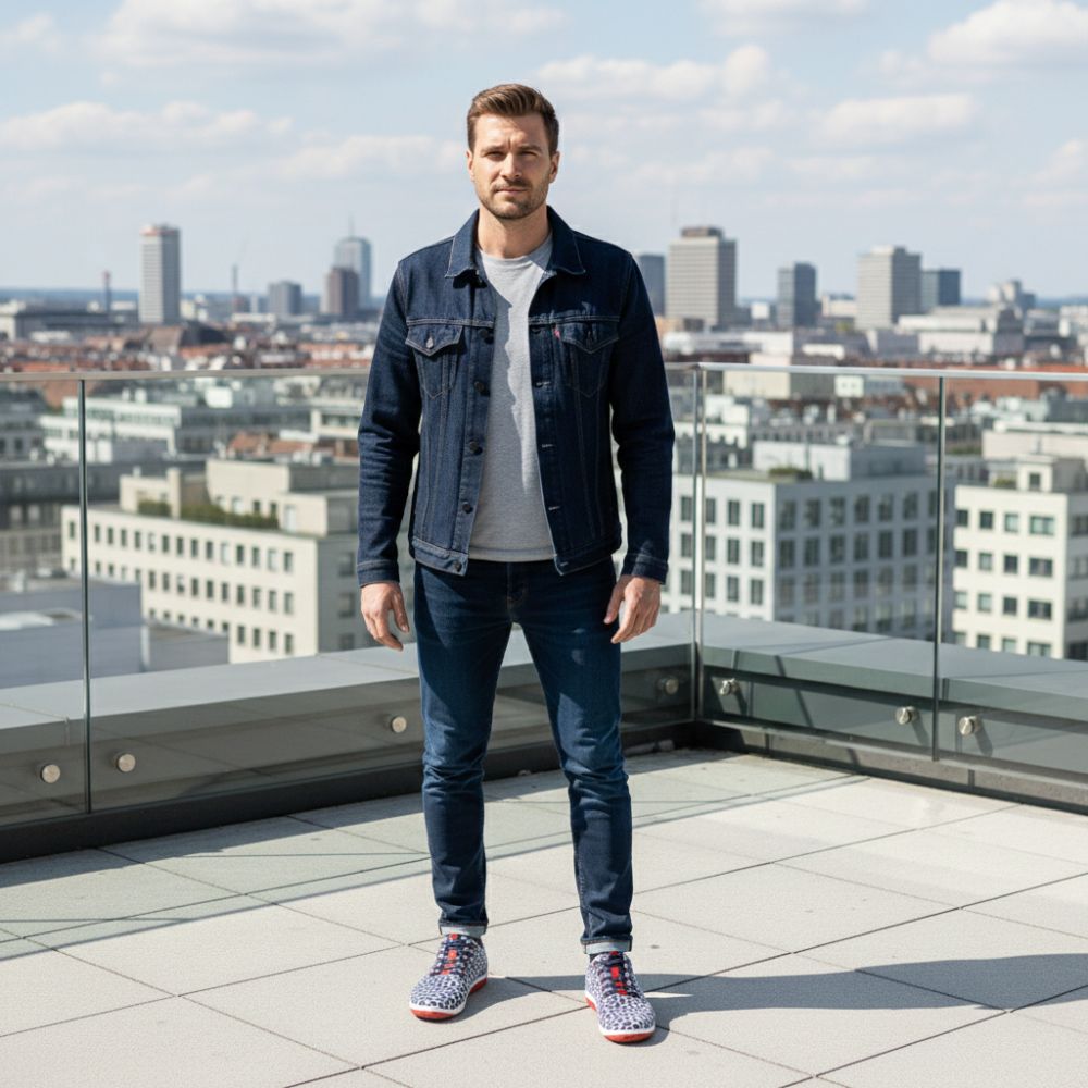 Für diesen Sneaker verwenden wir graublaues Premium Nappaleder, welches mit einem Netz aus hellgrauer Microfaser überzogen ist. Dadurch entsteht dieses einzigartige Muster. Mit den roten Akzenten im Bereich der Schnürung und der Sohle entsteht ein stimmiges Gesamtbild.