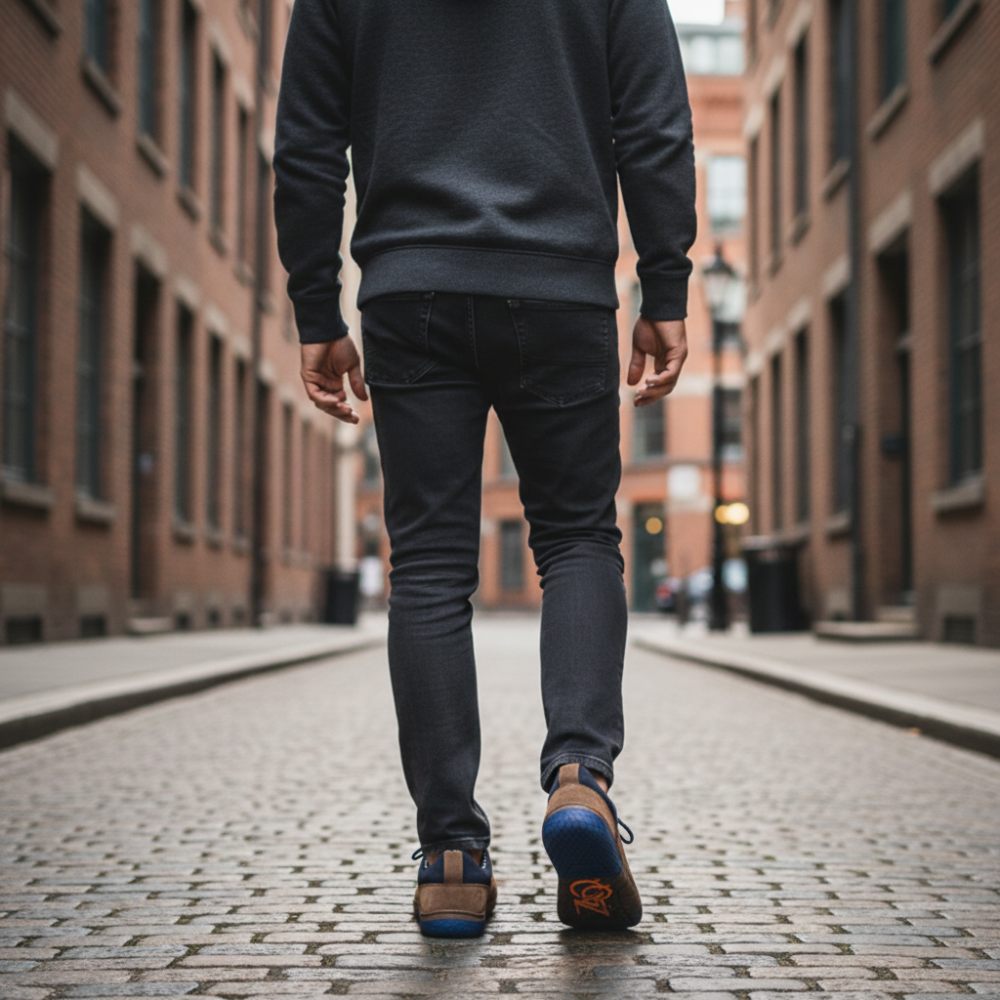- Kautschuksohle mit Nullabsatz, dadurch Entlastung der Wirbelsäule und Schonung der Gelenke, unterstützt die natürliche Körperhaltung