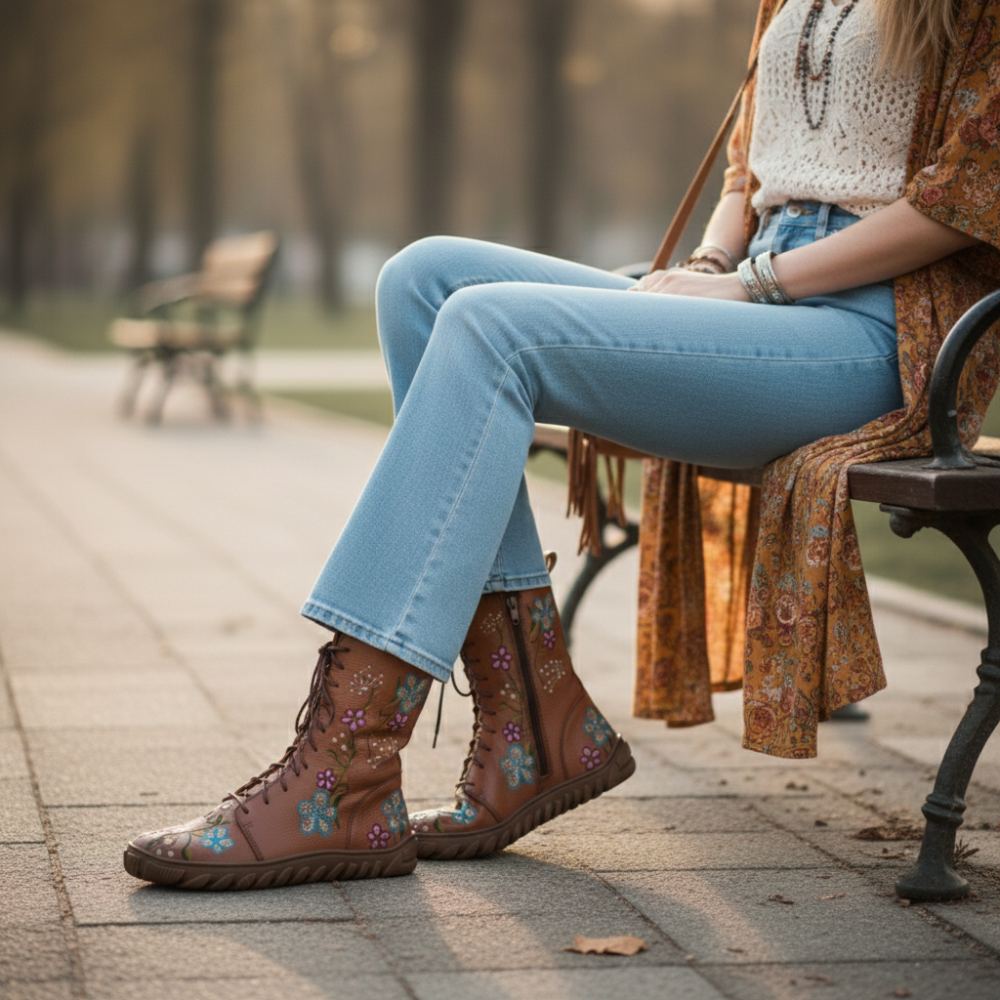 Ezek a csizmák melegbarna hangon, egyedi virágteljesítmény -kialakítással díszítve, nemcsak optikai kiemelés, hanem a szabadság és a természetesség szimbóluma is. A Premium Nappa bőr nagy minőségű megjelenést biztosít, míg az alap cipzára és a kötés lehetővé teszi az egyéni illesztést és a könnyű meghúzást.