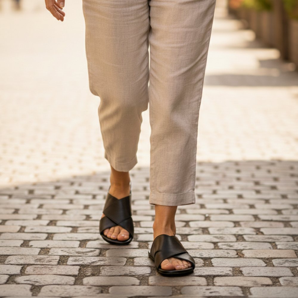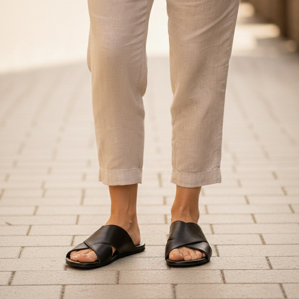 Két keresztezett bőrpántokkal, amelyek a legjobb megállítást kínálják, egyszerűen becsúszhat a Manqa fekete szandálba, és a legteljesebben élvezheti a napját. Nincs csat, nincs fodros - csak tiszta kényelem és szabadság a lábad számára. Ezek a szandálok egyesítik a mezítláb cipő könnyűségét a divatos kiegészítő eleganciájával.